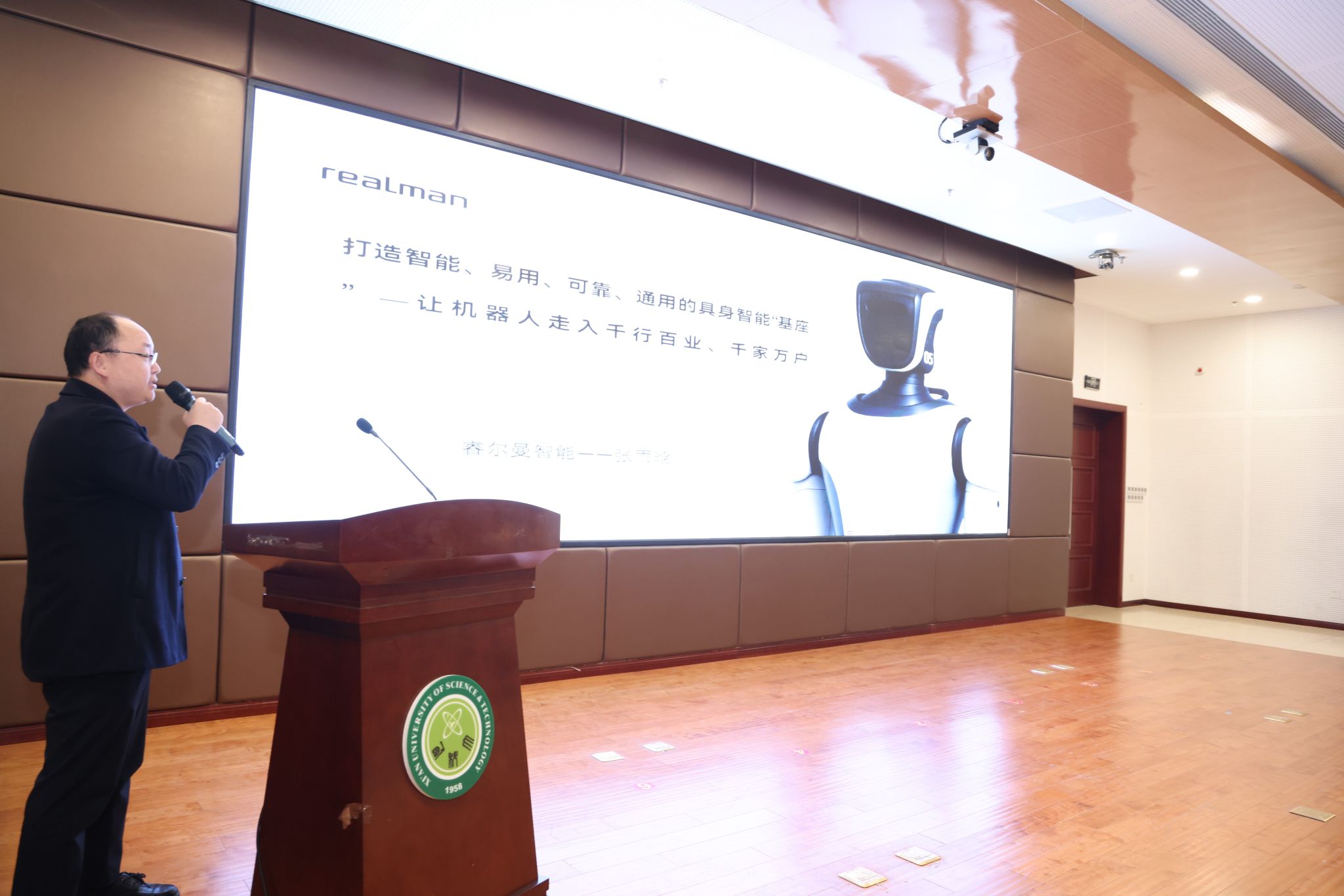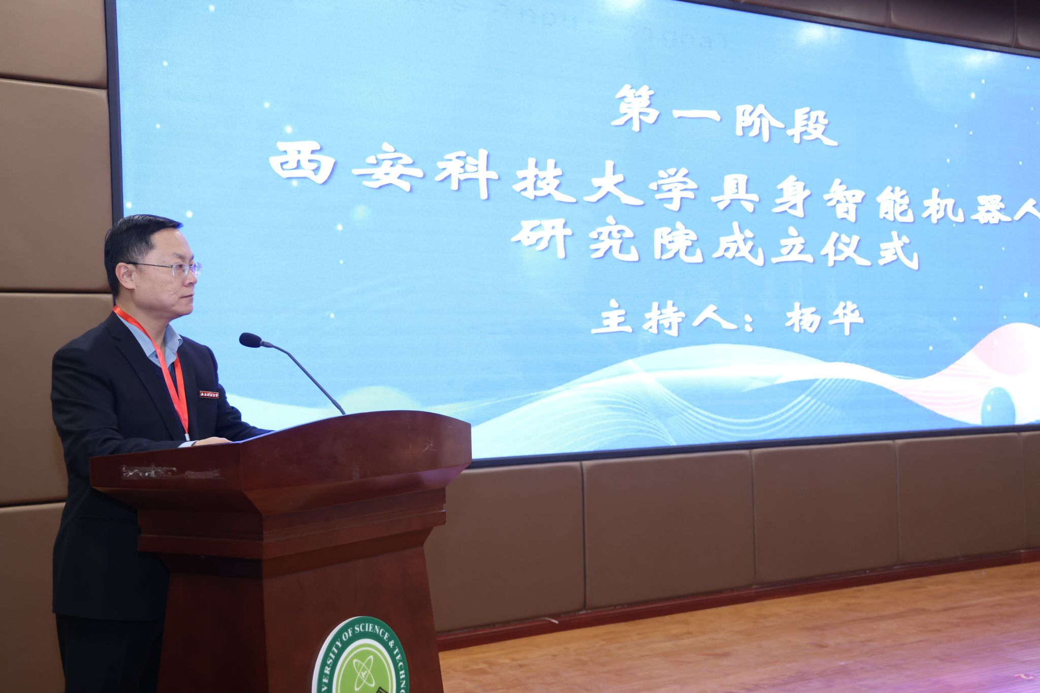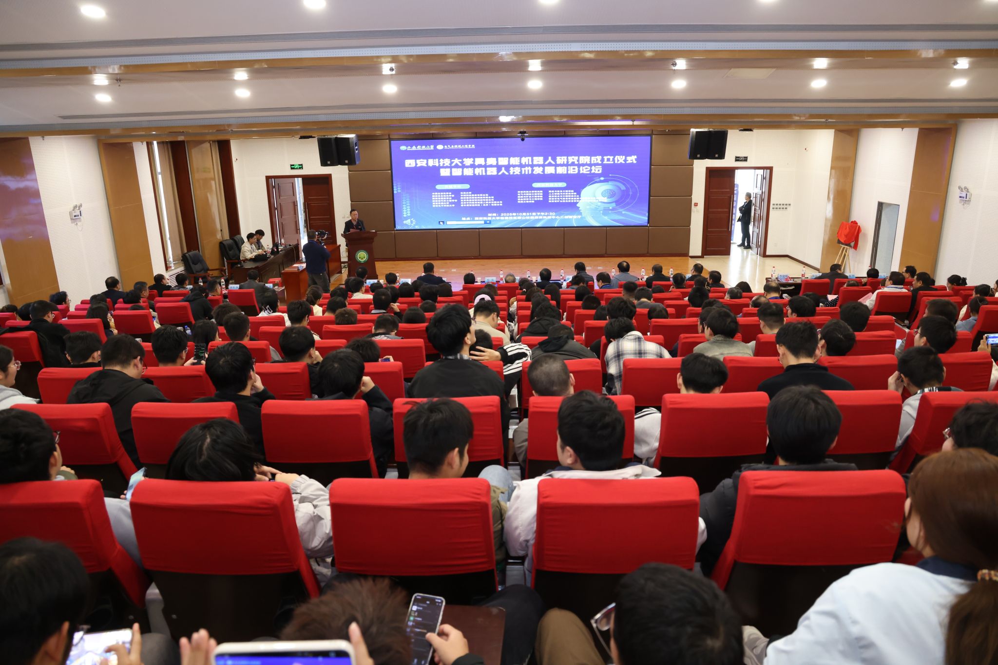 10月31日下午,15vip太阳集团具身智能机器人研究院成立揭牌仪式暨智能机器人技术发展前沿论坛,在我校临潼校区骊山校园煤炭科技中心二楼报告厅举行。中国自动化学会具身智能专业委员会副理事长、西安交通大学人工智能学院副院长孙宏滨教授、陕西省自动化学会副理事长、秘书长、西安交通大学自动控制研究所所长曹建福教授、陕西省煤炭学会常务副理事长惠维渊、秘书处干事薛煜亮、陕西省汽车工程学会常务副理事长、陕西汽车集团有限责任公司科技管理部部长刘大鹏、智能感知与图像理解教育部重点实验室副主任、西安电子科技大学人工智能学院执行院长侯彪教授、工信部新能源与智能网联汽车专家、长安大学汽车学院韩毅教授、苏州汇川技术有限公司校企合作西部总经理赵凯、陕西重构智信科技有限公司董事长兼总经理张西京、北京具能创智科技有限公司西北大区总经理刘红艳、北京中科慧灵机器人技术有限公司市场总监尹浩、睿尔曼智能科技(北京)有限公司经理张雨晗等应邀出席,我校副校长文虎,科技处、对外联络与合作处等职能部门以及安全科学与工程学院、人工智能与计算机学院、机械工程学院负责人以及相关学院师生共计300余人参加。揭牌仪式及前沿论坛由15vip太阳集团党委书记杨华及院长寇发荣主持。