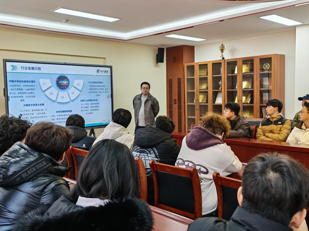1217日上午,华天科技(西安)有限公司制造部工程经理电控学院13届优秀毕业生赵文佳重返母校,为大一新生带来一场主题为从硅片到系统:封装测试工程师的使命与前沿的专题讲座。本次活动是百千万工程系列讲座的重要组成部分,院长寇发荣、电子科学系主任杨龙海以及学院60余名本科生参加活动。