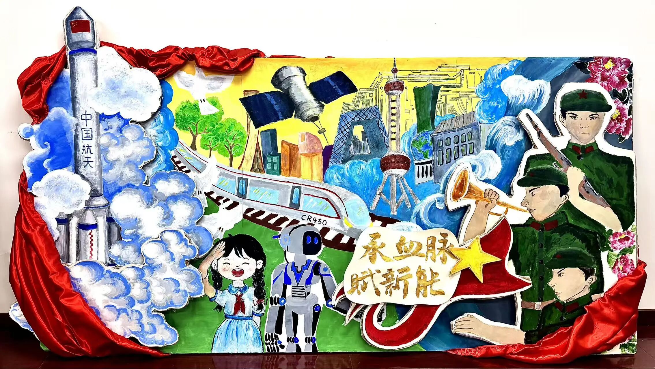 该作品将红色基因传承与当代发展主题有机融合:画面中,军人形象象征着红色精神的赓续延续;印有“中国航天”标识的火箭、CR450高速列车、卫星与智能机器人等元素,集中展现了我国在航天、交通与科技等领域取得的重大成就;东方明珠与现代建筑群等城市意象,与和平鸽、盛放的牡丹相互映衬,喻示国家的繁荣发展与和平稳定。作品以立体化的艺术语言,将“红色血脉传承”与“新时代创新赋能”深刻结合,诠释了家国发展进程中精神延续与时代奋进的核心内涵。
