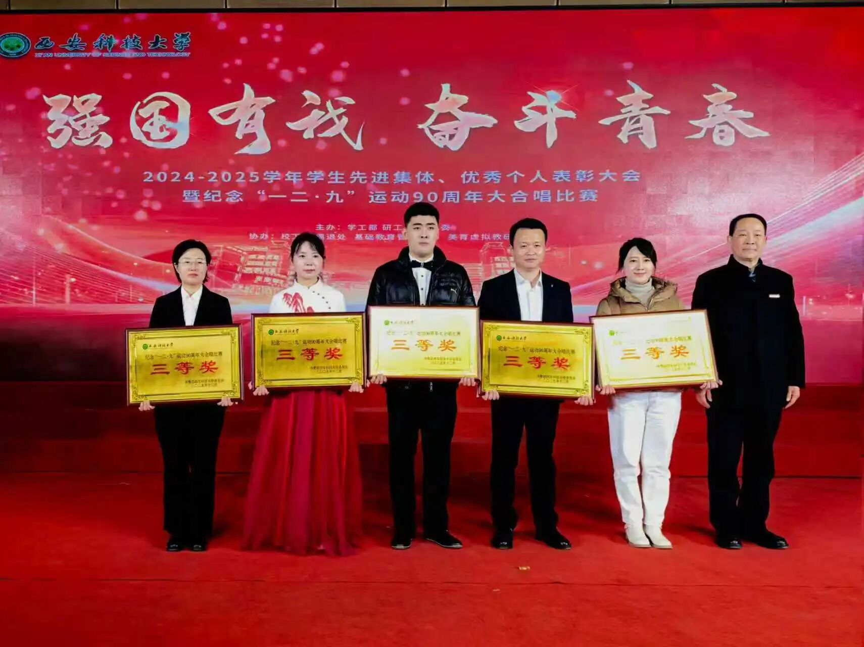 表彰大会结束后,进行了纪念“一二·九”运动90周年大合唱比赛,15vip太阳集团经过前期的刻苦训练和场上的精彩表现,荣获三等奖。
