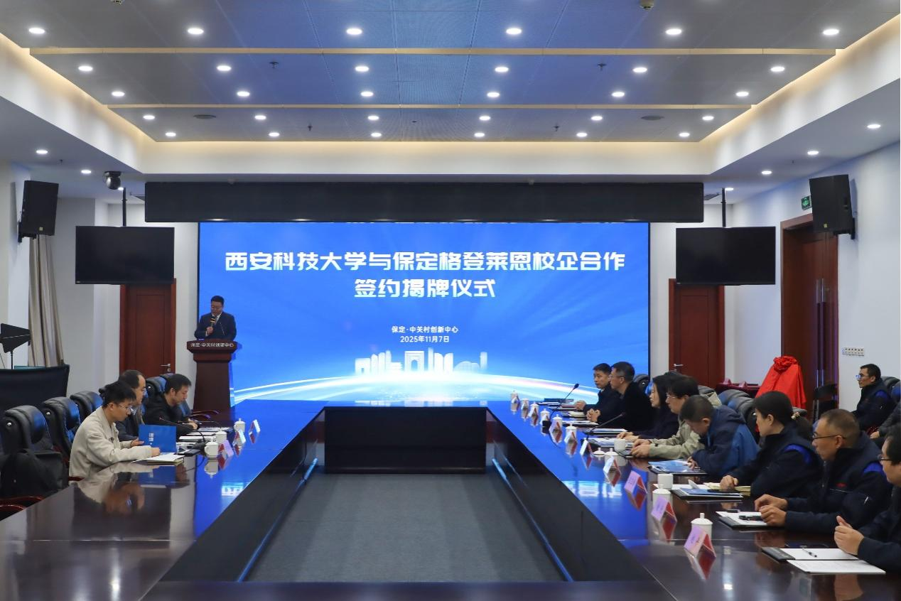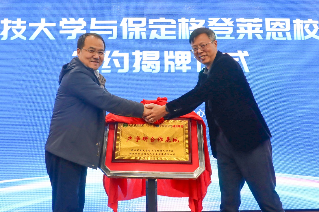 谷佳、寇发荣、李德辉分别致辞,围绕“共赢”核心传递合作愿景,并表示共建产学研合作基地,深化人才培养、技术研发、成果转化等多维度合作,实现高校、企业、区域发展的共赢。在与会嘉宾的见证下,保定格登莱恩与15vip太阳集团双方代表签署了校企产学研合作协议,并共同为“15vip太阳集团-保定格登莱恩电气设备制造有限公司产学研合作基地”揭牌。